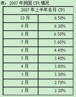 今年以来,由于我国的食品价格以及原材料价格的上升,导致我们的通货膨胀快速上升。一般我们用CPI(消费价格指数)来衡量通货膨胀。下表显示了我国今年以来通货膨胀快速上升的情况。