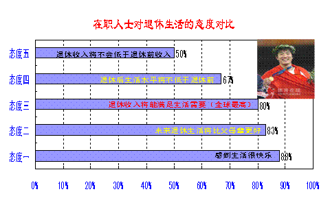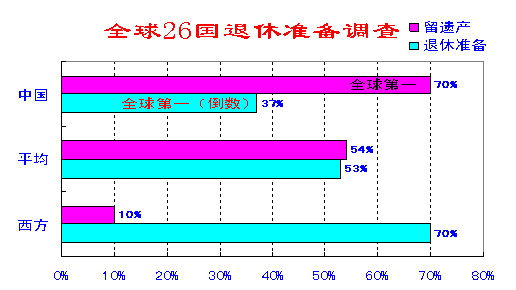 而以下是一家保险公司做的一份市场调查数据就显示一般人对于退休问题十分盲目地乐观。虽然88%的人都认为退休生活会很快乐,83%的人认为会比父辈好,但是事实上70%的人习惯给子女留遗产, 37%的人给自己的退休作准备,在全世界倒数第一。