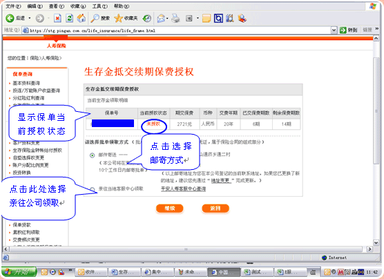 2、选择生存金抵交续期保费授权项目,显示名下可操作变更的保单列表,点选保单号码后进入操作页面: