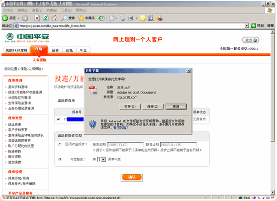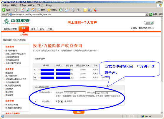 4.投连/万能险帐户收益查询页面。投连险种提供“区间收益报告”,万能险种提供“区间收益报告”和“年度报告”: