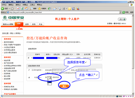 8.选择年度报告,在下拉列表中选择您的保单所经历年度: