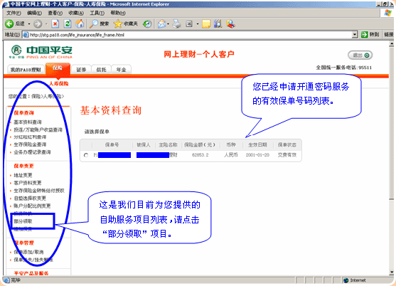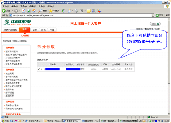 4.部分领取自助服务首页。显示您可操作部分领取的保单列表: