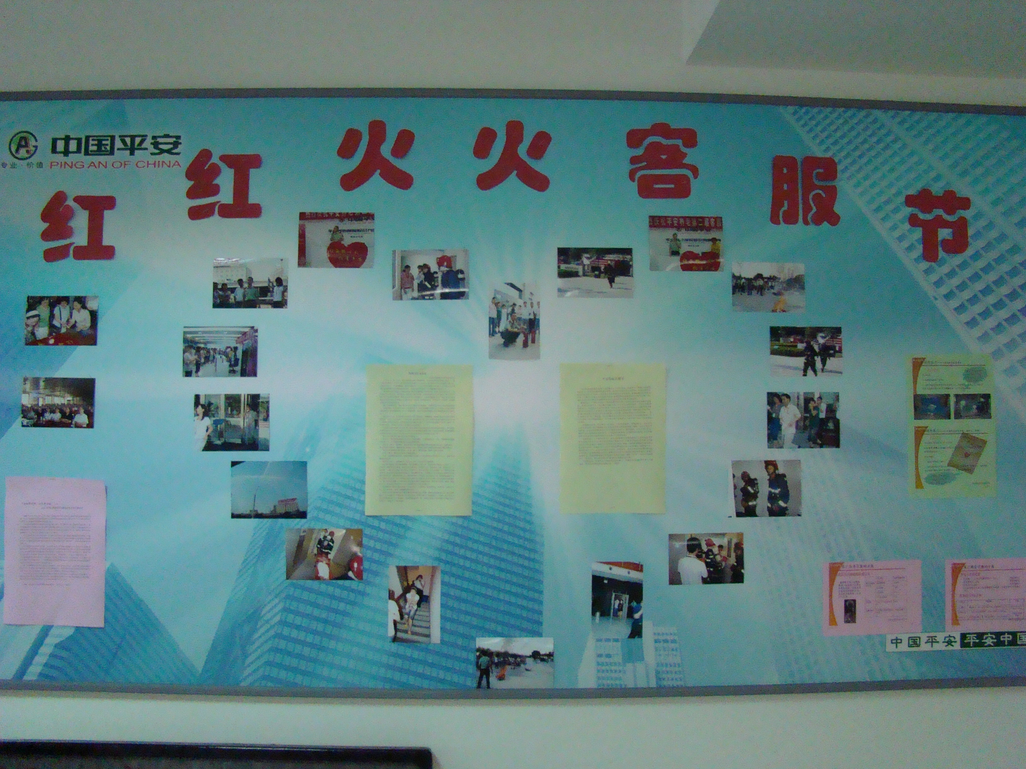 “红红火火客服节”作为本期展板的版头,衬以心形的防灾演习及心理援助照片,再配上相关活动报道,顿时使原本肃然的展板变得丰富多彩。展板内容从前期的活动总结到后期的激励方案,可谓一应俱全。无论是我们的员工还是前来办业务的客户,都被我们丰富的客服展板内容所吸引驻足。