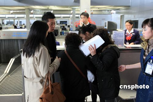 图为遇难者家属在工作人员陪同下办理登机手续。 中新社发 汤彦俊 摄