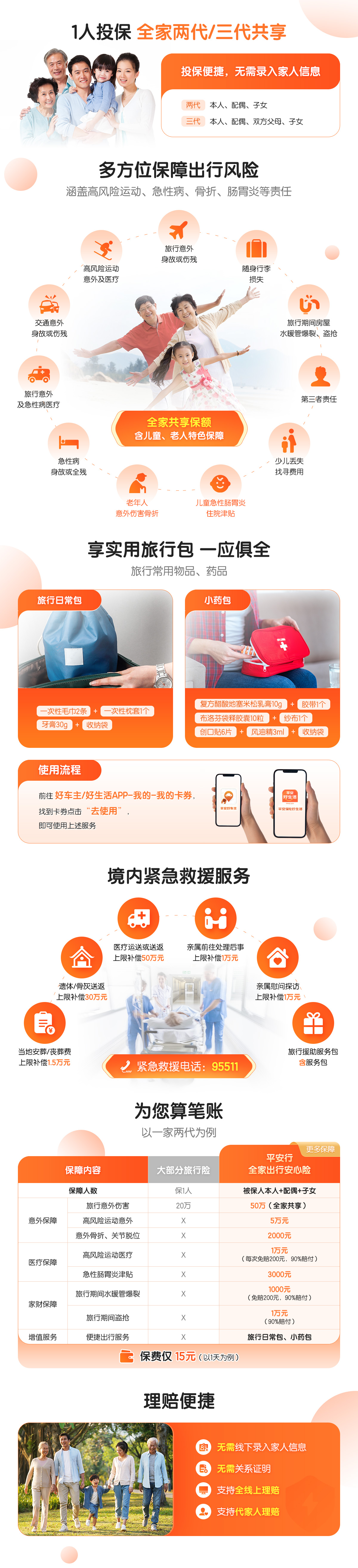| 意外伤害身故和残疾 | 保险期间內,被保险人在旅行期间因遭受意外伤害事故导致身故、伤残。 主被保人16岁 (含) 至 65岁(含) 保险金额为500000元/人;连带被保人 0岁(含) 至10岁 (含) 保险金额为200000元/人,连带被保人11岁 (含) 至60岁 (含) 保险金额为500000元/人, 连带被保人 61岁 (含) 至65岁 (含) 保险金额为250000元/人、连带被保人66岁(含) 至80岁 (含) 保险金额为50000元/ 人。 | |
