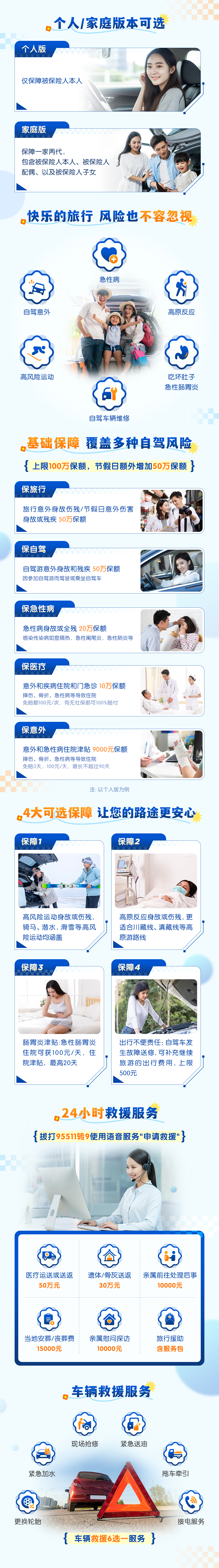 | 自驾意外身故 | 个人版:保险期间内,被保险人因参加自驾游而驾驶或乘坐自驾车期间因遭受道路交通意外伤害事故导致被保险人身故或伤残的。 家庭版:保险期间内,被保险人因参加自驾游而驾驶或乘坐自驾车期间因遭受道路交通意外伤害事故导致被保险人身故或伤残的。 主被保人 16岁(含)至 65 岁(含)保险金额为 500000元/人。 | |