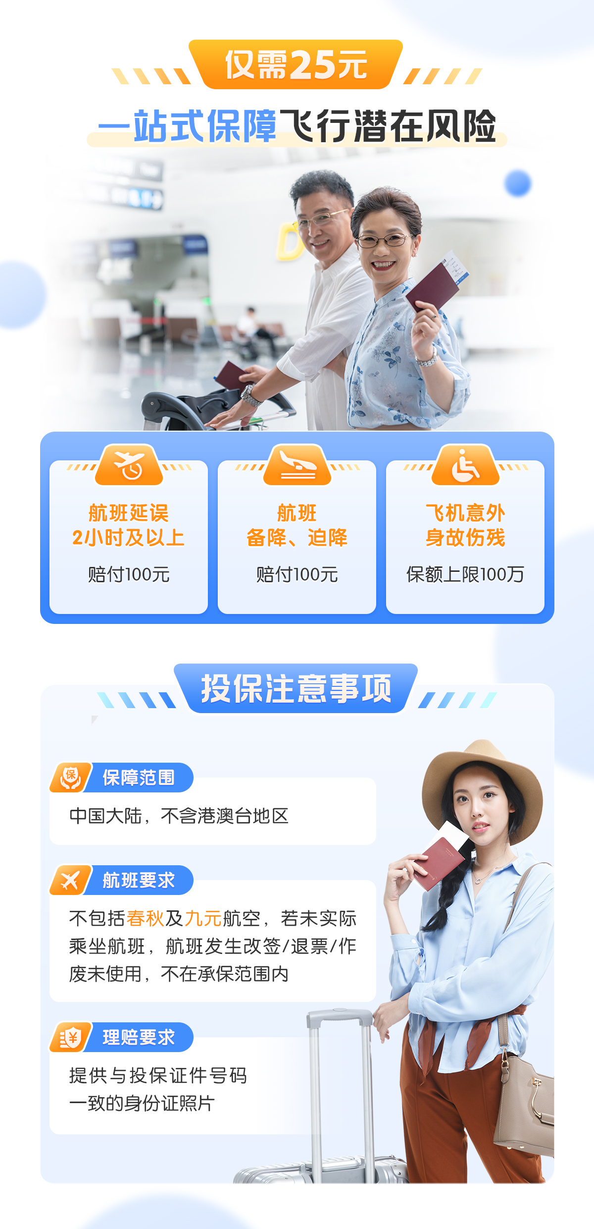答:本保险的保障范围为中华人民共和国(不含港澳台地区)境内民航定期航班(不包含春秋航空和九元航空的航班)。备注:定期航班,是指安排公布的时刻实行飞行、对公众开放销售的收费航班。