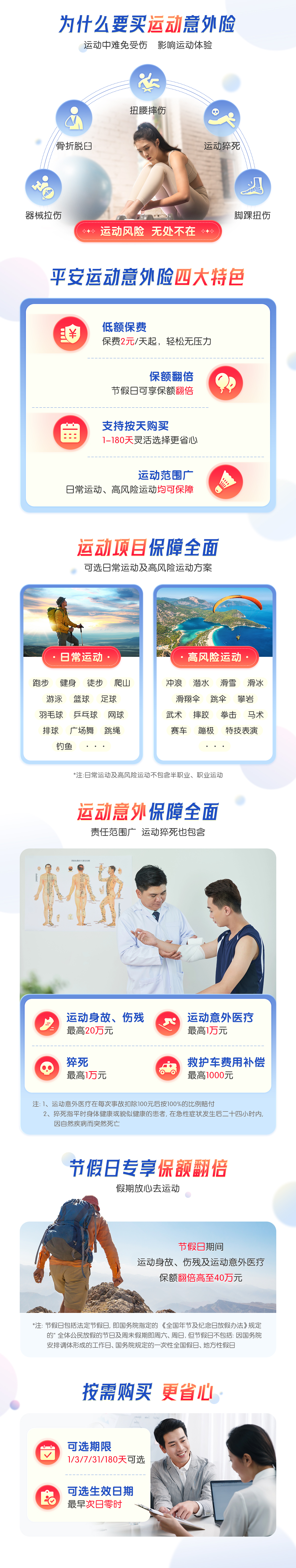 | 附加法定节假日限额翻倍险 | 1.保障内容:保险期间内,被保险人在“节假日”期间发生运动意外身故、运动意外残疾的,相应的保险金额可翻倍赔偿节假日包括,1)“法定节假日”,即国务院制定的《全国年节及纪念日放假办法》规定的“全体公民放假的节日”;2)周末假日,即周六、周日。但节假日不包括:因国务院安排调休形成的工作日、国务院规定的一次性全国假日、地方性假日。 | |