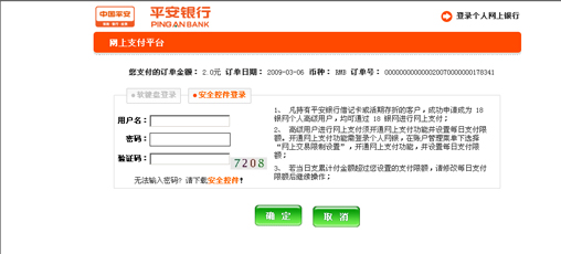 第三步:跳转到平安银行网银页面。填写用户名、网银登录密码和验证码,点“确定”提交。