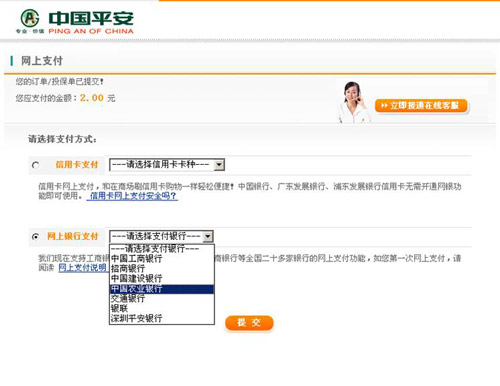 第二步:点选网上银行支付方式,在下拉列表中选择农业银行网银支付。哪种支付方式适合我呢?