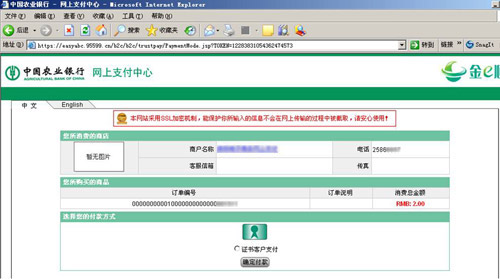 第三步:跳转到农业银行网银页面。点选证书客户支付,再点击“确定付款”按钮。