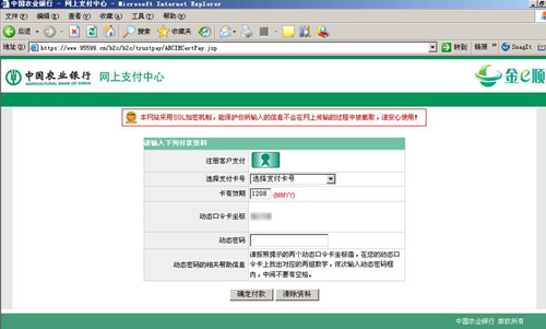 第五步:如果您是电子口令卡用户,将看到以下页面。请在“选择支付卡号”框内选择您要使用的农行卡,在动态密码处输入动态口令卡上给定坐标处显示的号码,最后点击“确定付款”按钮。