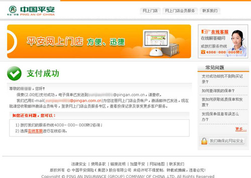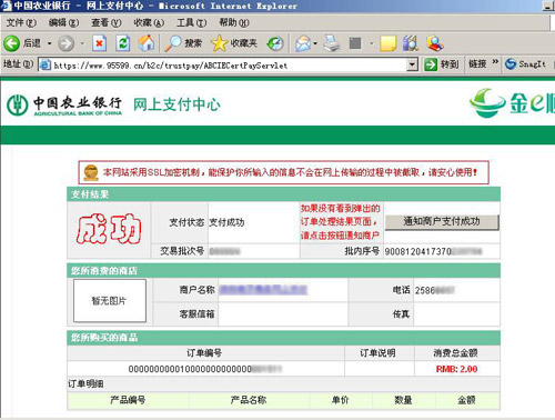 第七步:恭喜您,支付成功了!您将看到农行给出的支付成功页面,以及平安网站反馈的支付成功页面。