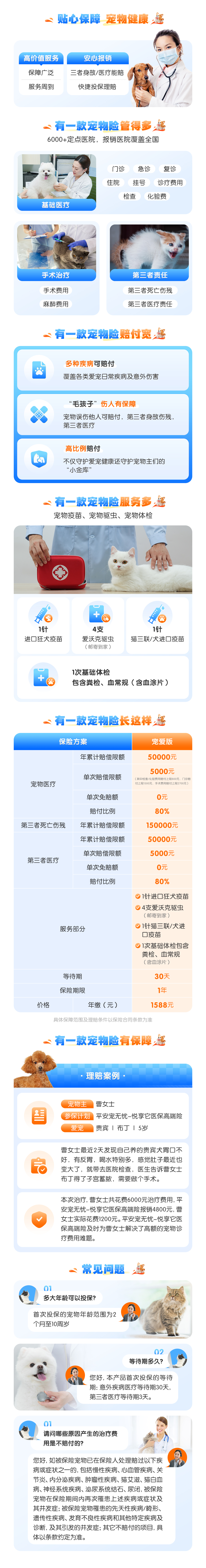 7、本产品中,宠物意外疾病医疗年赔付上限5w元、0免赔,赔付比例80%,单次赔付上限5000元(其中单次检查/化验费用不超过800元,门诊费用不超过1500元、手术费用不超过2700元),不限赔付次数;宠物三者医疗年赔付上限5w,0免赔,赔付比例80%,单次赔付上限5000元,不限赔付次数;宠物三者身故残疾年赔付上限15w。