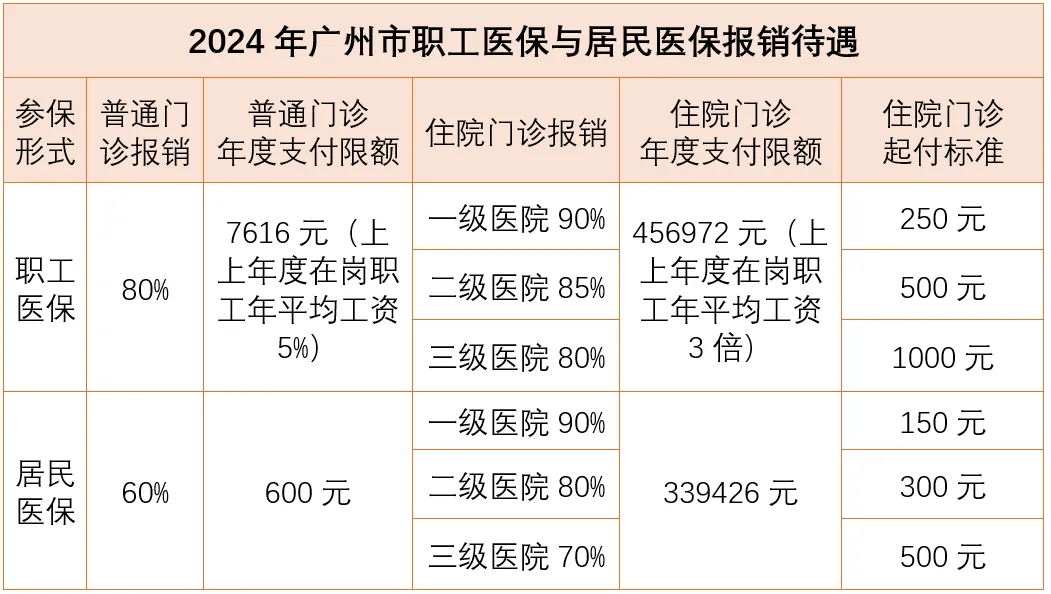 职工医保每月会下发一笔固定医保费用,可以用来自费买药、看病挂号等,也就是我们的医保个人账户里的钱。而居民医保没有个人账户,看病买药时如果无法报销,只能花自己的钱。同时职工医保的报销待遇还要高于居民医保,一般情况下,职工医保报销比例在80%左右,而居民医保报销比例维持在60%左右。我们以广州市的报销比例为例: